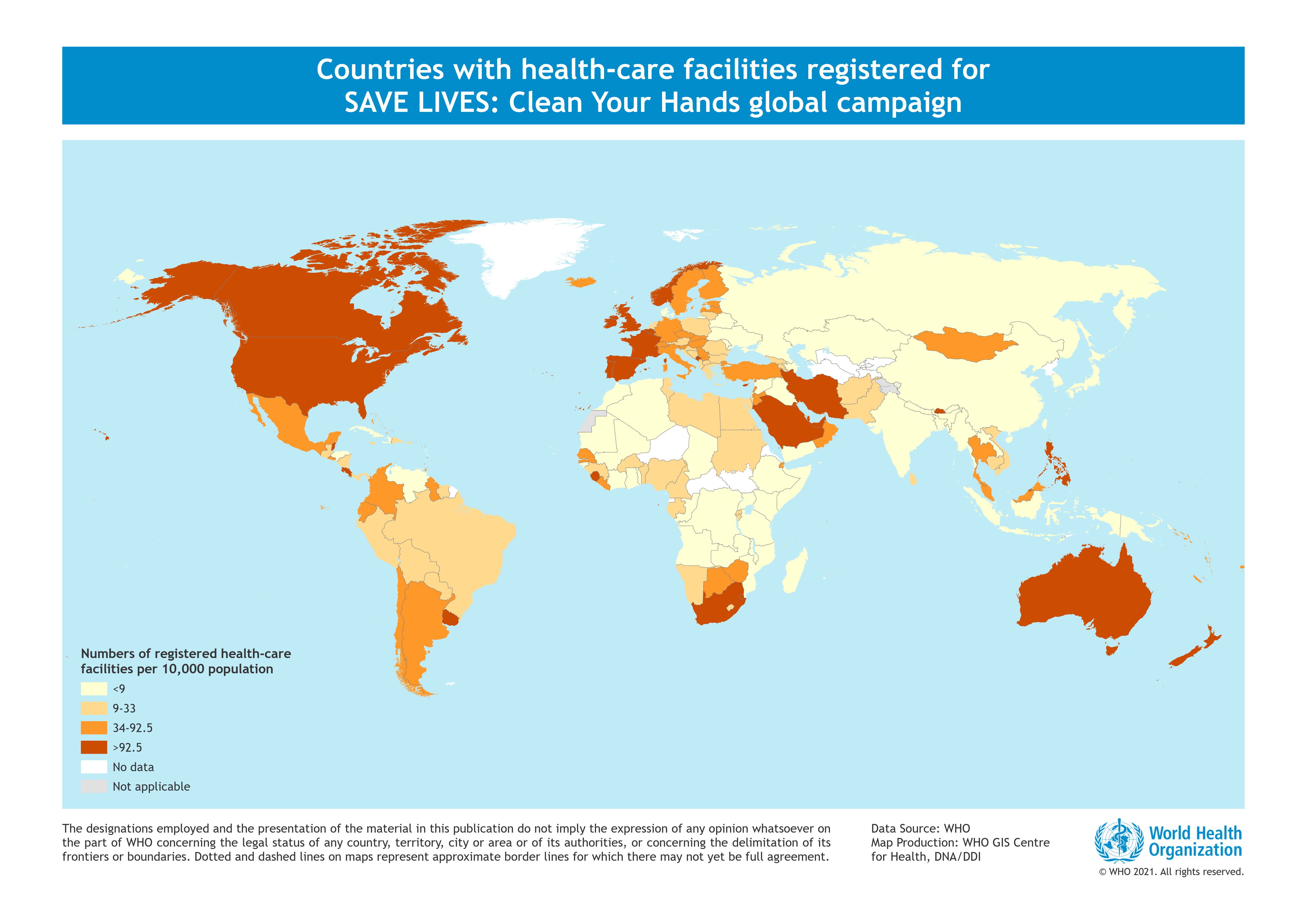 As of 28 April 2021, a total of to 24815 hospitals and health-care facilities in 184 countries or areas have registered their commitment to hand hygiene as part of the global campaign – SAVE LIVES: Clean Your Hands. Numbers are not 100% correct due to duplicated submissions of data; number of staff and beds – as submitted by registrants.