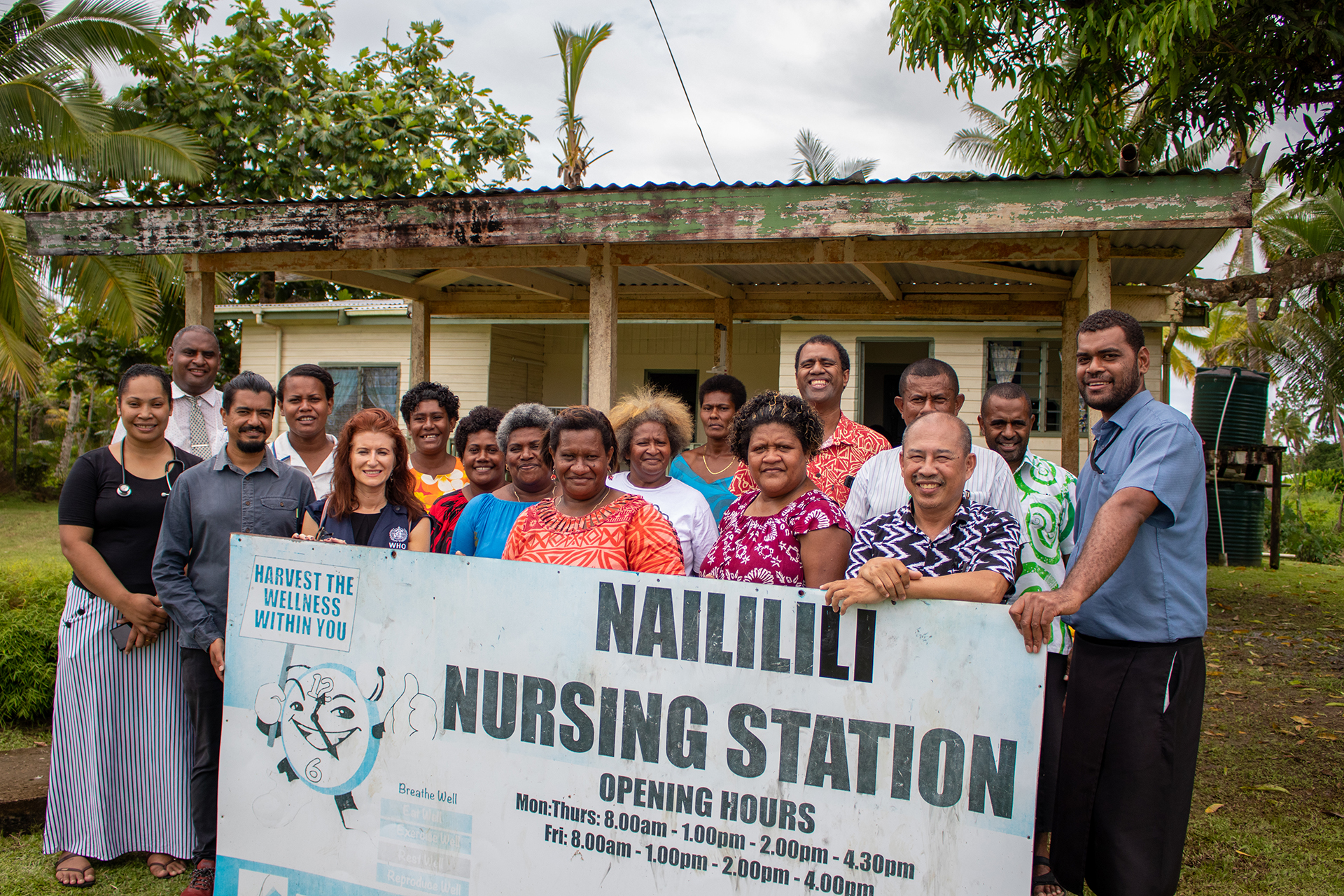 WHO and Naililili staff and patients outside the Nursing Station. Community Health Worker Anamaria Raicoki pictured second from left, back row