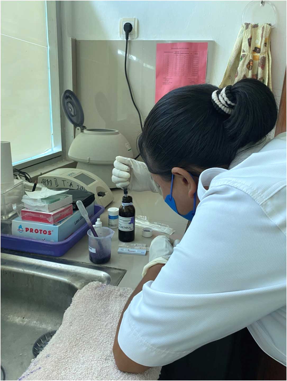 Fig. 2. A laboratory technician is preparing a Giemsa solution for staining blood smear from a suspected malaria case at PHC Wedomu, Belu district, Indonesia. ©WHO, 2021