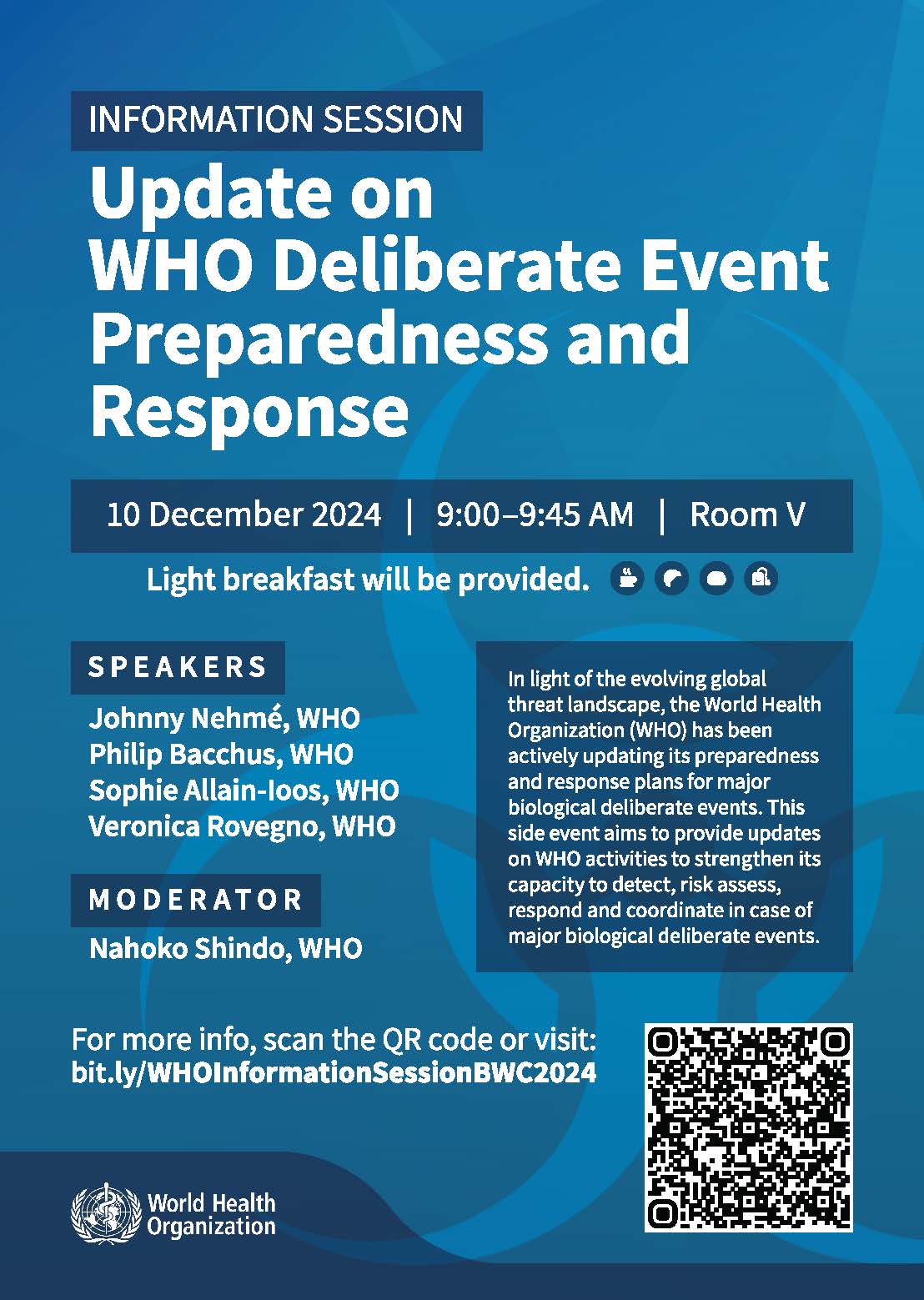 The Biosecurity and Protection Unit (BSP) of WHO Emergencies Programme organizes this information session for the UN Biological Weapons Convention to provide updates on WHO's activities aimed at strengthening its capacity to detect, assess the risks of, respond to, and coordinate major biological deliberate events.