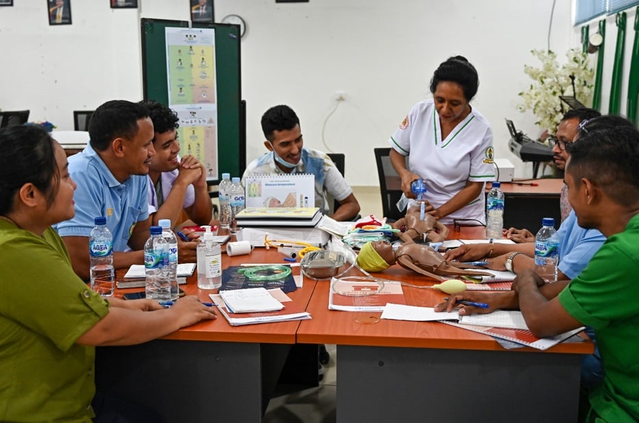 During the training, the experts identified six master trainers, to conduct further training sessions. In December 2023, under the supervision of an international expert, this first batch of Timorese master trainers rolled out the course to staff from maternity and emergency departments at HNGV.